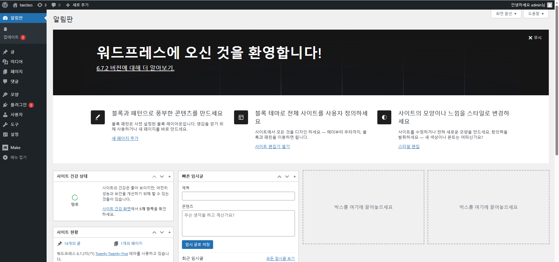 "다양한 관리 위젯이 있어요! 이것들은 끌어서 놓기로 위치를 변경할 수도 있죠. 빠른 초안 위젯 📝은 아이디어를 빠르게 저장하기 좋고, At a Glance 위젯 👁️🗨️은 사이트의 페이지, 게시물, 댓글 수 등 현황을 한눈에 보여줘요. 활동 위젯 📈은 최근 게시물과 댓글을, WordPress 이벤트 및 뉴스 패널 📰은 WordPress 커뮤니티 소식을 알려줘요."